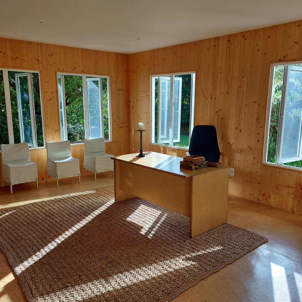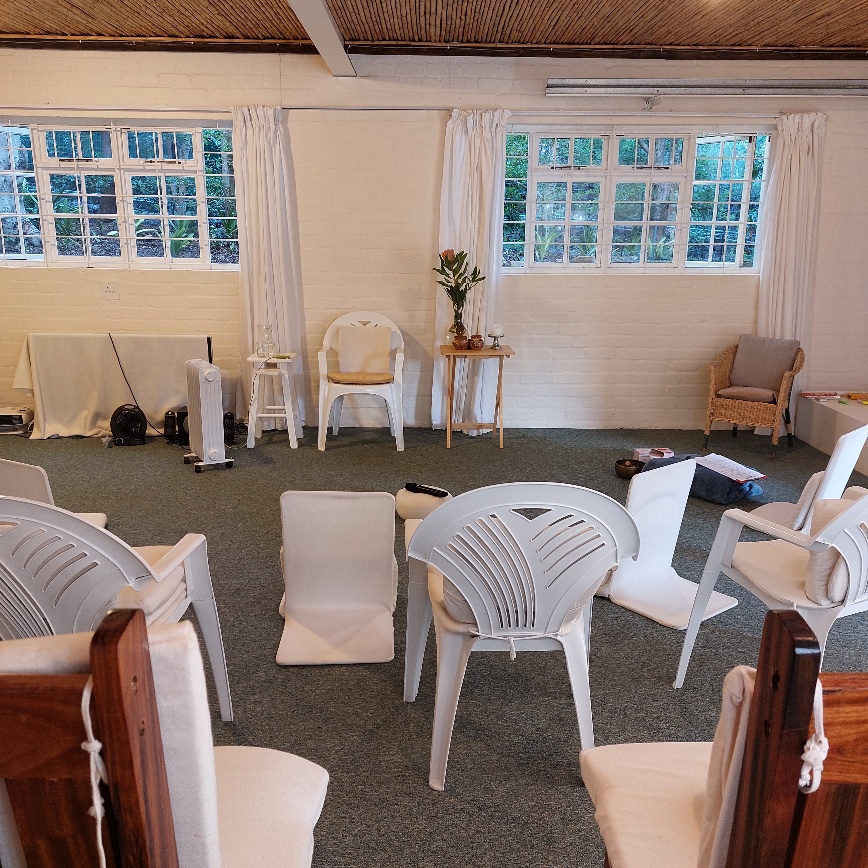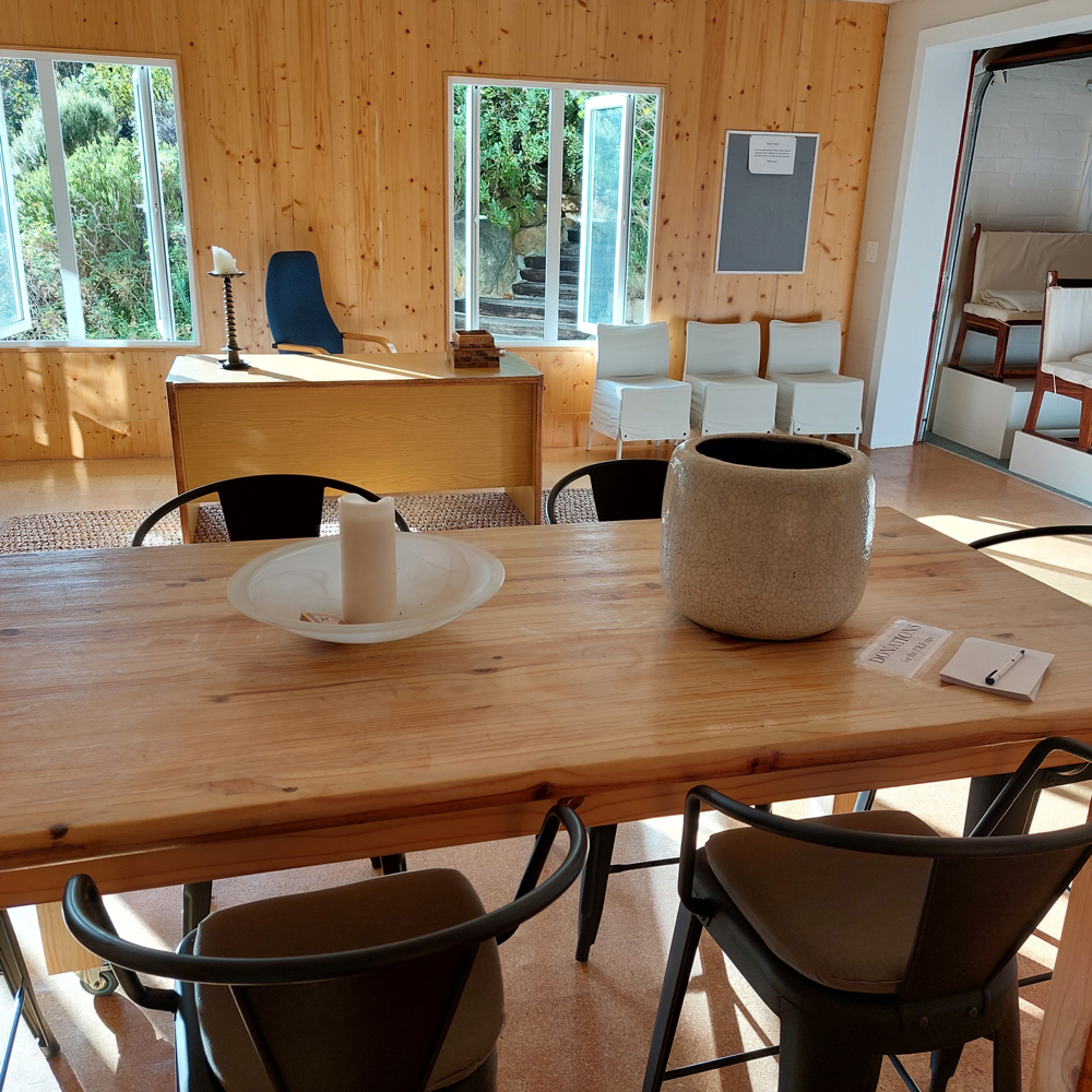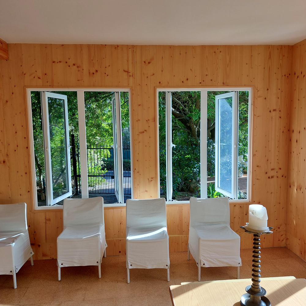 The wooden floors and large sliding window-doors open wide to the surrounding mountain views & green tree-filled gardens, creating an intimate space of ‘home’ and holding: An invitation to be spacious and free. Chairs and meditation seats are available. It can seat at least 18 people with social distancing in mind.