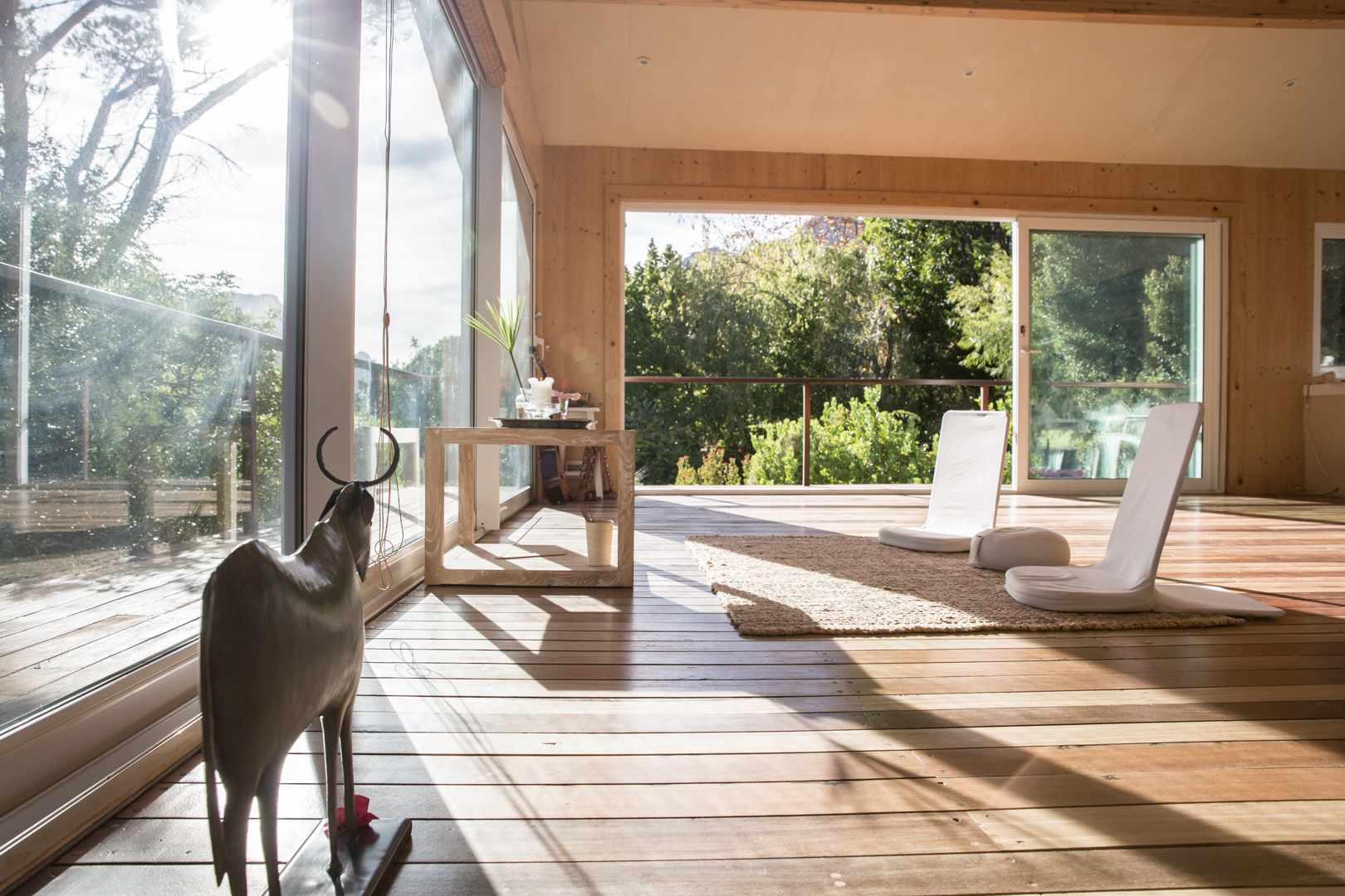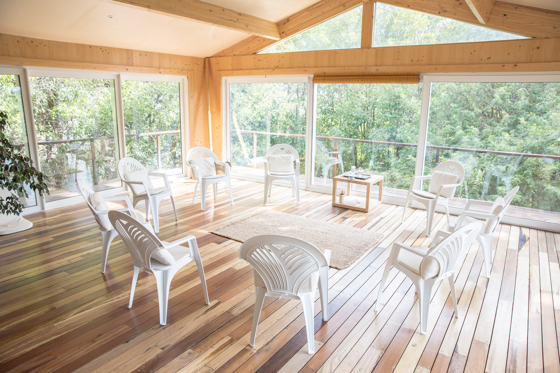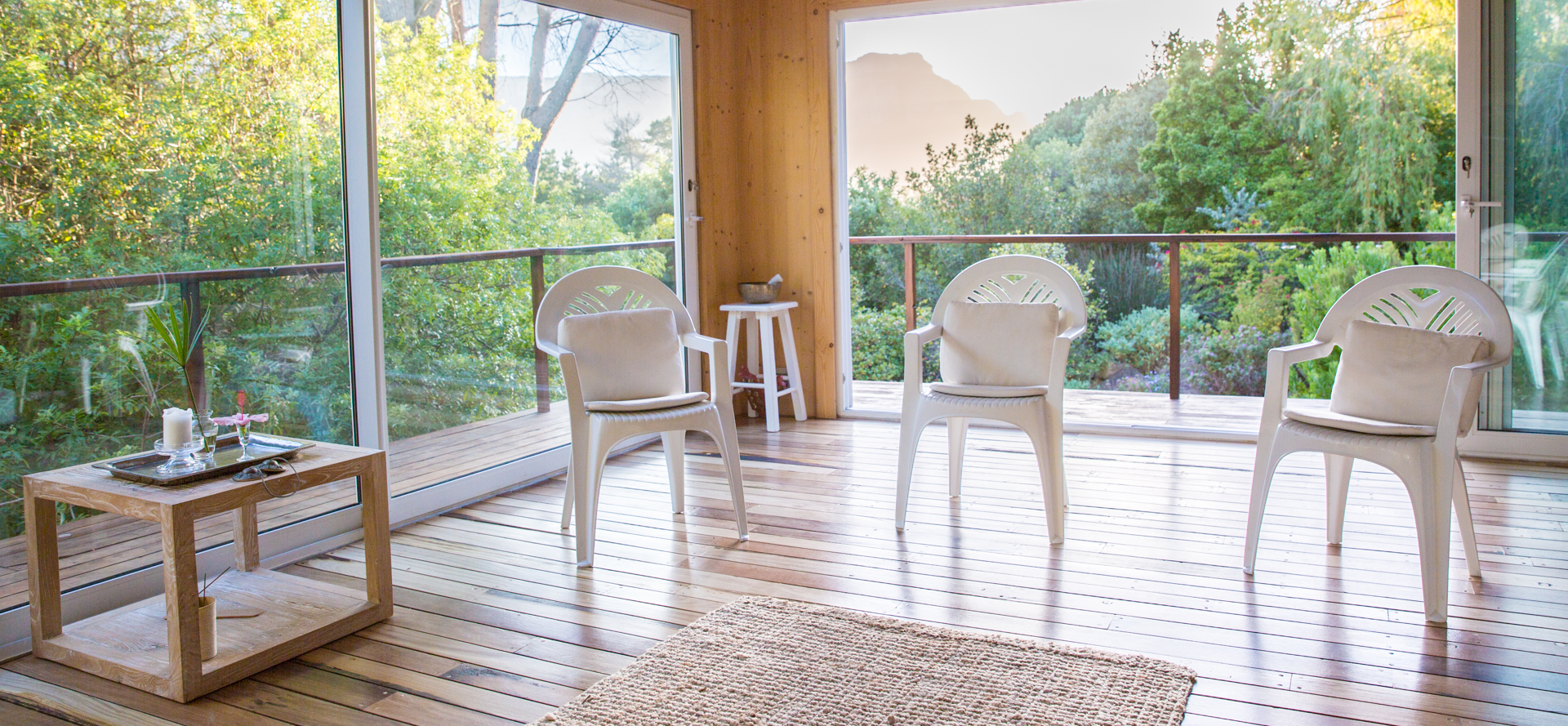 The wooden floors and large sliding window-doors open wide to the surrounding mountain views & green tree-filled gardens, creating an intimate space of ‘home’ and holding: An invitation to be spacious and free. Chairs and meditation seats are available. It can seat at least 18 people with social distancing in mind.