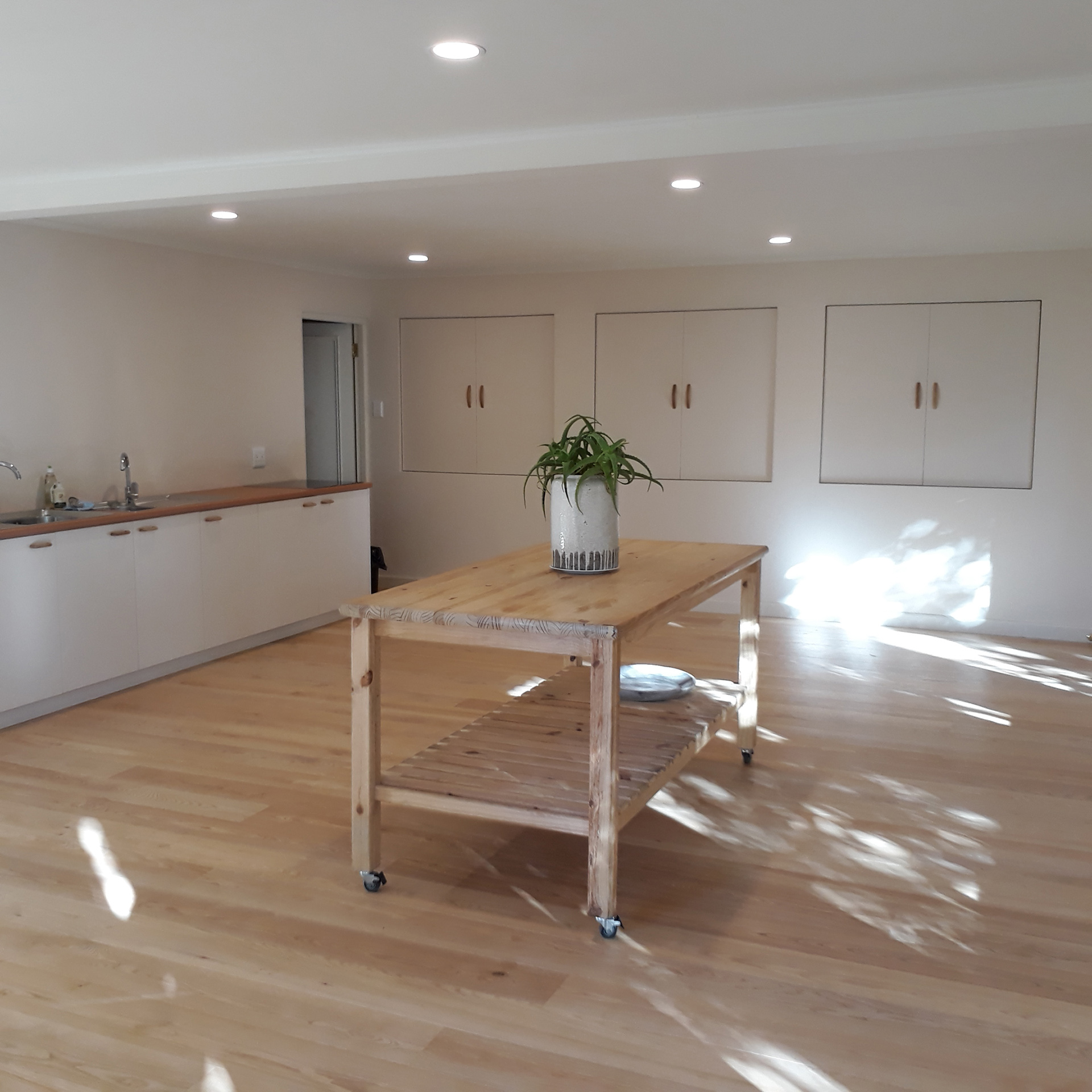 The front part lends itself for sharing teas and meals. It can transform into a welcoming reception area for your workshop or can be used as a break away space.